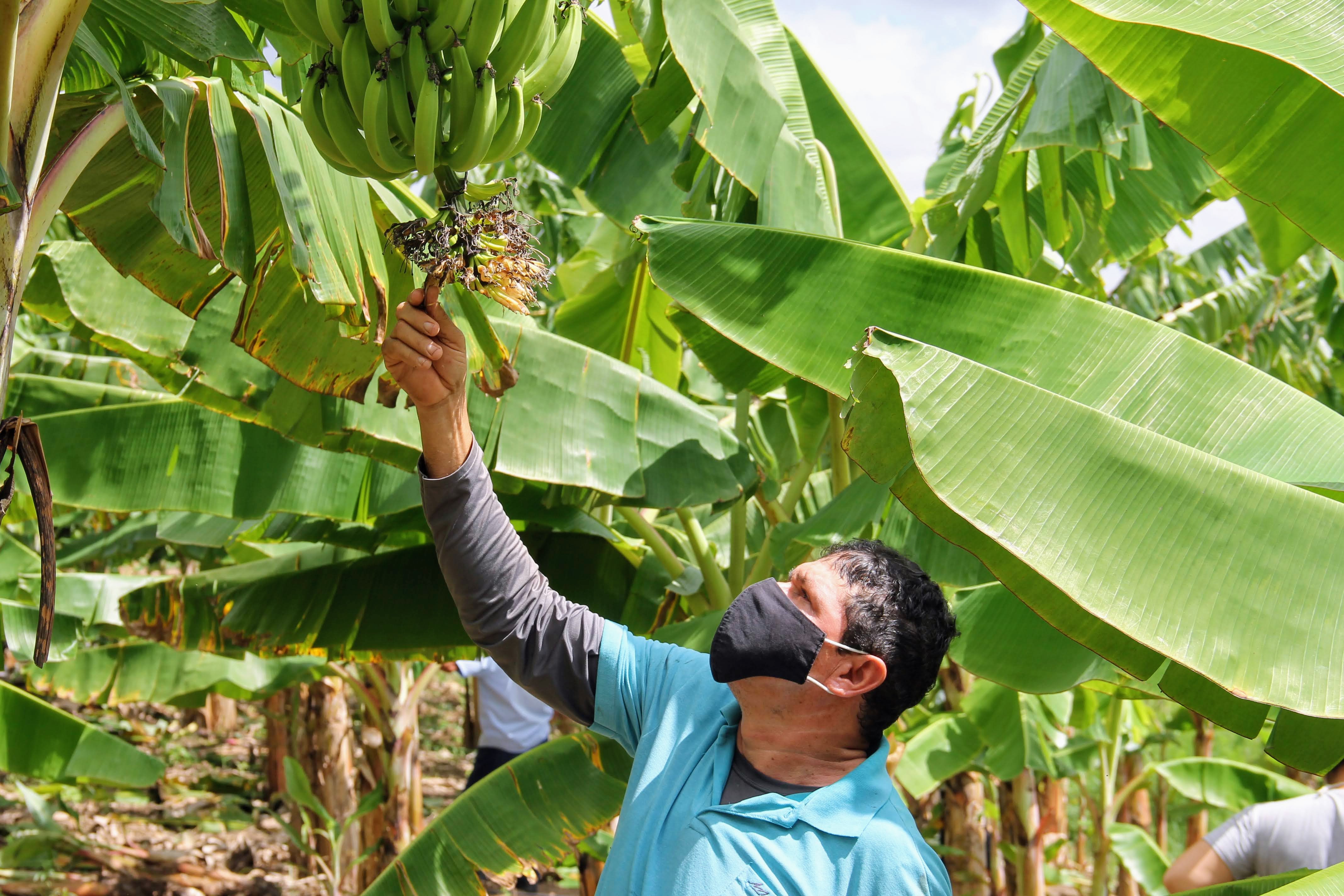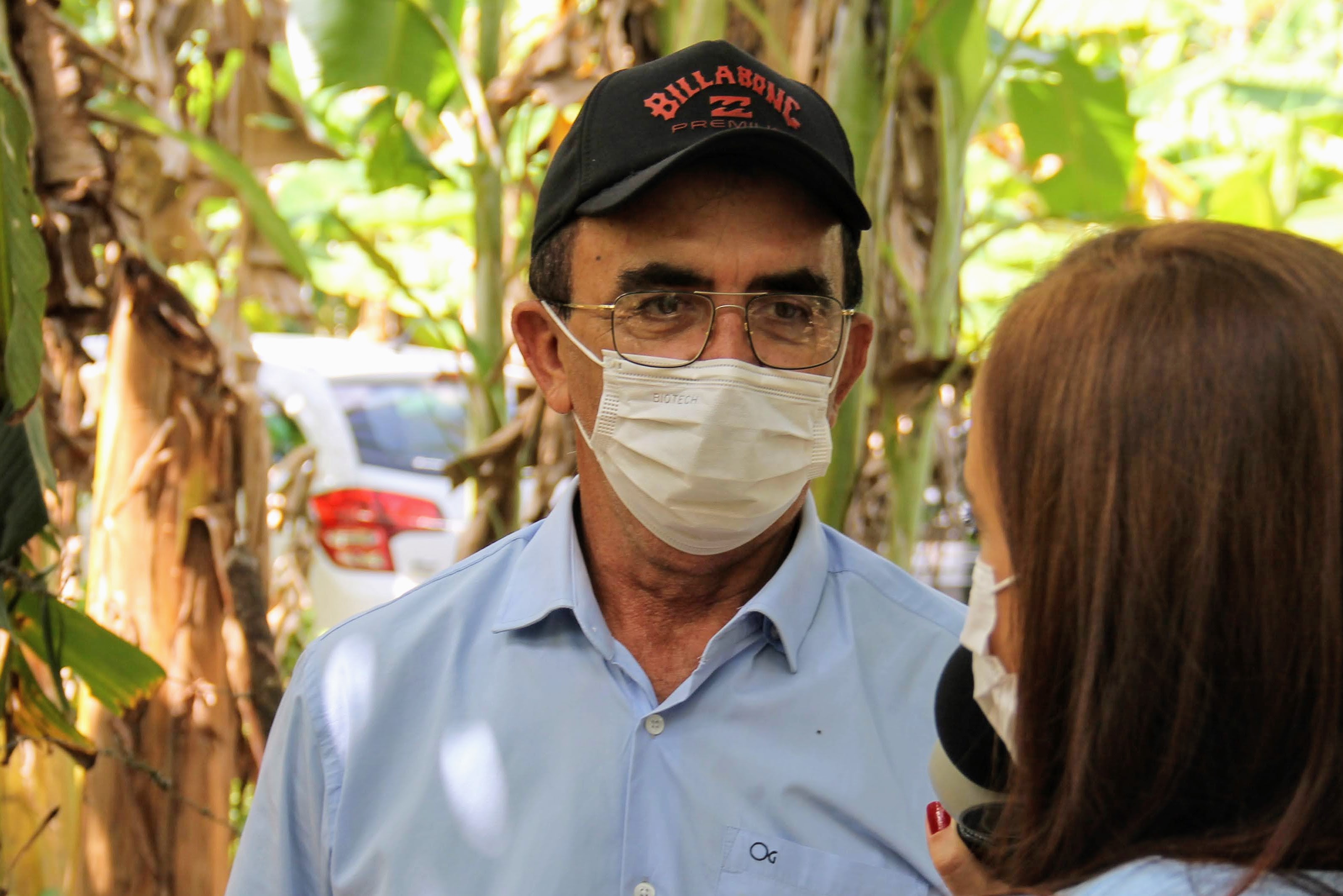 “Porque a banana da terra aqui, na nossa região, não tinha e vinha da Bahia, de fora, muito cara. Como eu tinha a [banana] prata, eu disse: é uma banana que eu vou fazer um teste aqui na minha área. Daí comprei ‘10 filhas’ [mudas que nascem ao pé da bananeira adulta], plantei e deu certo. Depois eu ampliei a plantação e tá dando bem ela”, avaliou Francisco de Araújo. O agricultor contabiliza que a produção da banana-da-terra já está compensando o investimento e a intenção é aumentar o tamanho da área ocupada pelo fruto, em seu lote de 8,5 hectares. “Eu já cheguei a tirar cachos de 45 kg e já cheguei a tirar aqui de 50 a 52 caixas de banana por semana, só dá terra”, comemorou o irrigante.