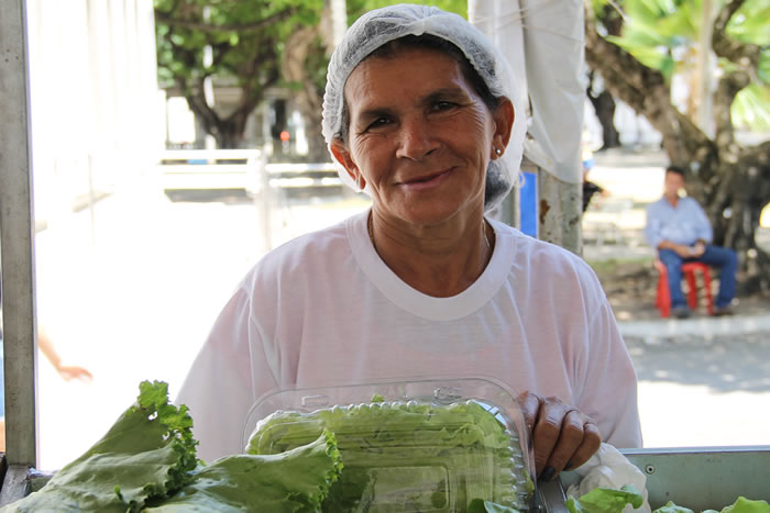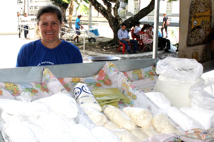 “É a primeira vez que venho em uma feira pública na Capital. Hoje participo da feirinha da Praça Filomeno Hora, formada só por agricultores atendidos pela Cohidro todo sábado, pela manhã. Para lá não levo só tapioca e farinha como hoje aqui, também vendo verduras que produzo no meu lote no Perímetro. Viemos num carro fretado por nós e que o Sebrae vai custear o gasto com combustível”, contou Joselita. Antes, ela foi um dos 99 beneficiados por kits do PAIS (Produção Agroecológica Integrada e Sustentável), fornecidos pelo convênio entre a Companhia e novamente o Sebrae, em todo Estado.