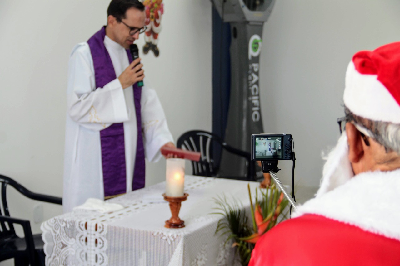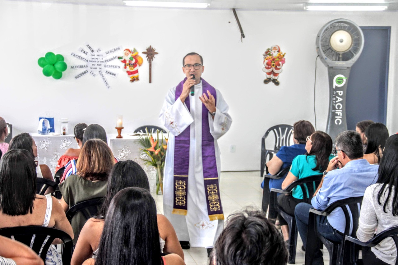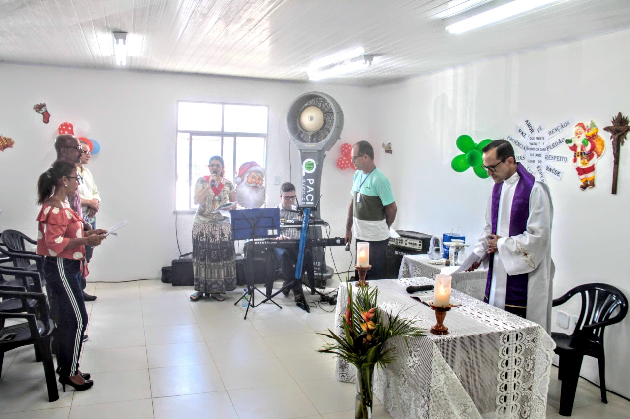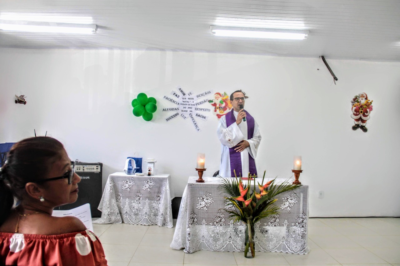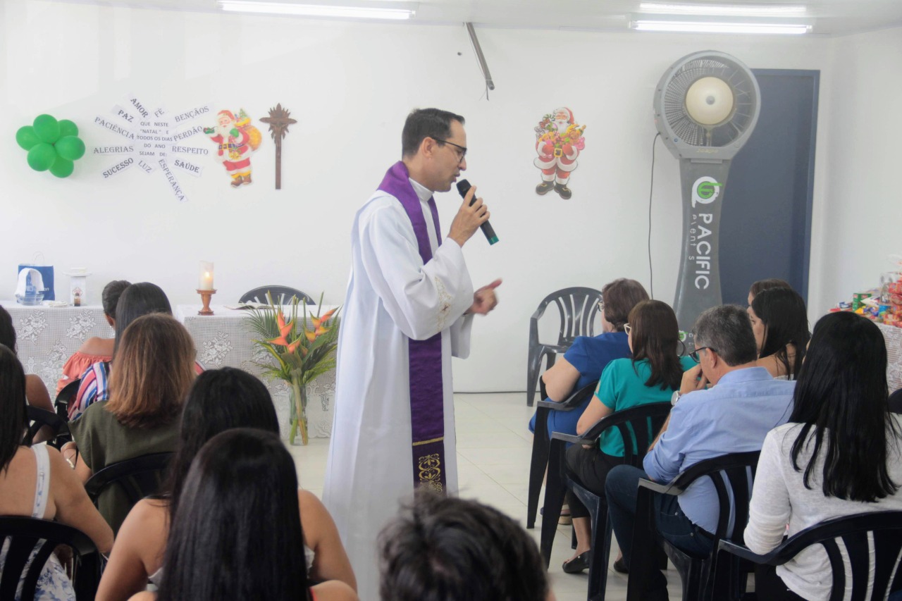 O final do expediente da sexta-feira (20), foi consagrado pela Missa de Natal, celebrada pelo padre Flávio Eduardo, da paróquia São Lucas, na Coroa do Meio, com o acompanhamento musical da dupla Fábio e Suerda. Foi ocasião para os funcionários fazerem as últimas entregas de alimentos à Campanha de Solidariedade organizada pela Divisão de Desenvolvimento Humano da Gerência de Recursos Humanos [DIDHU/GERHU]. Não-perecíveis que foram somados aos alimentos in natura também doados pelos agricultores irrigantes dos perímetros irrigados administrados pela Cohidro. Todos esses donativos foram inteiramente entregues à instituição beneficente Oratório de Bebê, que oferece às crianças e adolescentes atendimento assistencial, psicológico, médico e educacional.