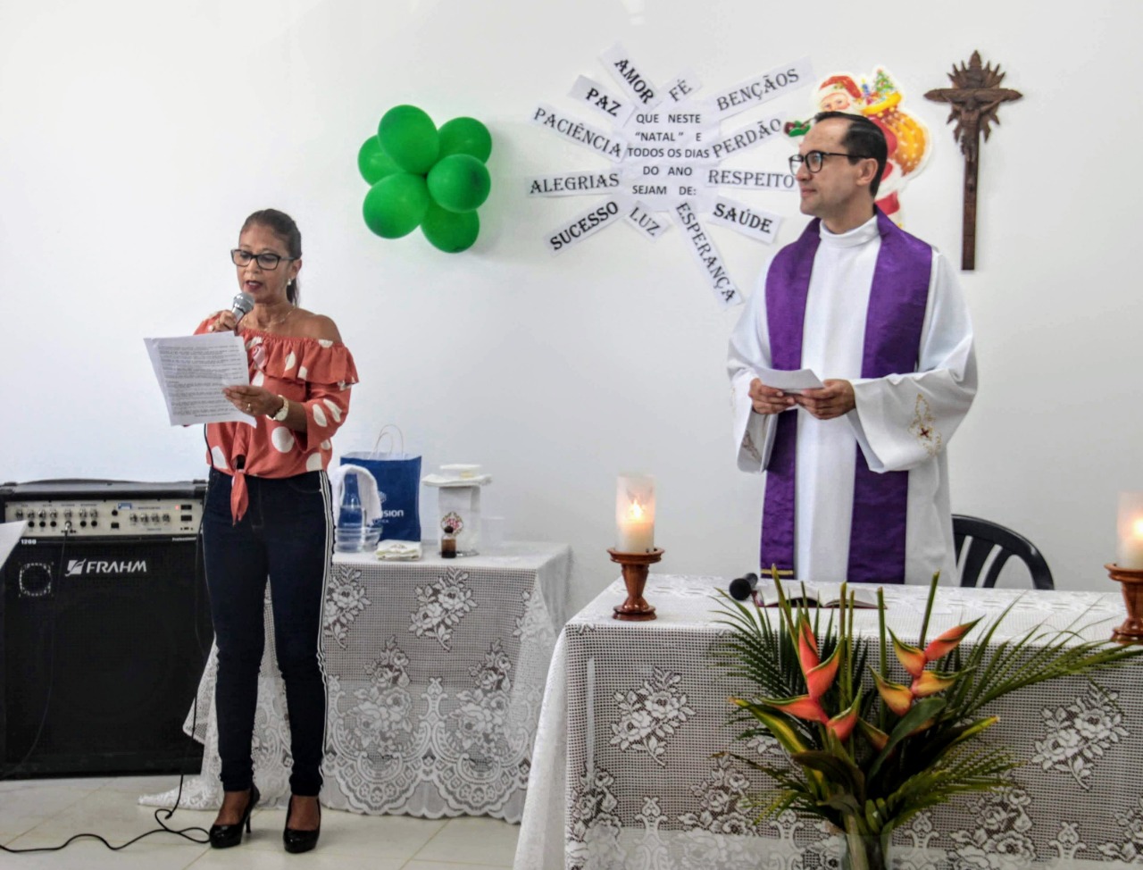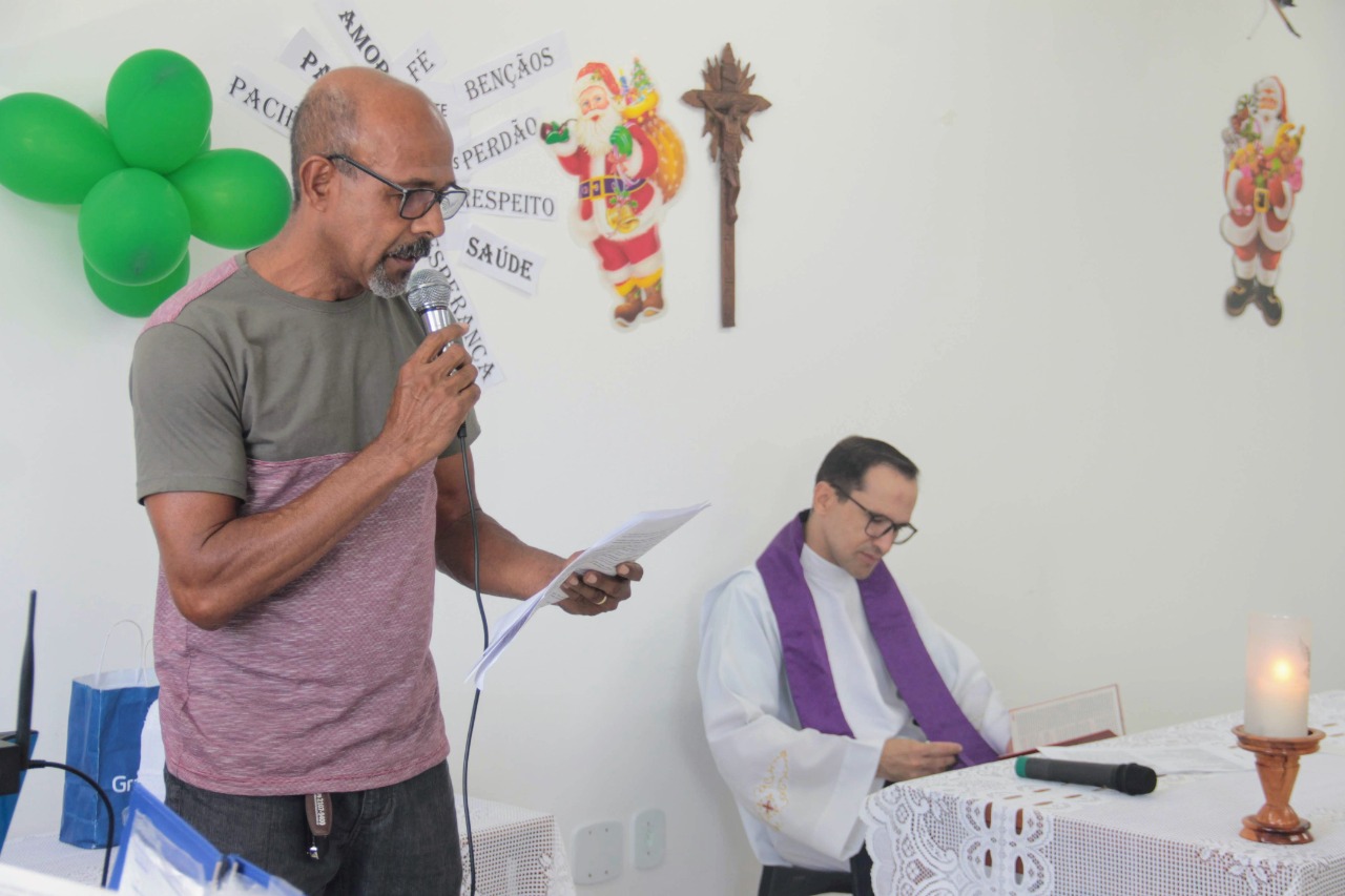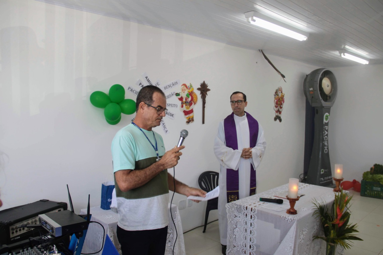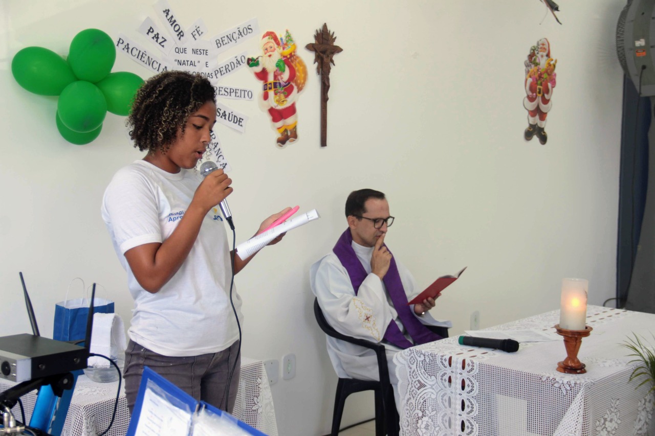 O final do expediente da sexta-feira (20), foi consagrado pela Missa de Natal, celebrada pelo padre Flávio Eduardo, da paróquia São Lucas, na Coroa do Meio, com o acompanhamento musical da dupla Fábio e Suerda. Foi ocasião para os funcionários fazerem as últimas entregas de alimentos à Campanha de Solidariedade organizada pela Divisão de Desenvolvimento Humano da Gerência de Recursos Humanos [DIDHU/GERHU]. Não-perecíveis que foram somados aos alimentos in natura também doados pelos agricultores irrigantes dos perímetros irrigados administrados pela Cohidro. Todos esses donativos foram inteiramente entregues à instituição beneficente Oratório de Bebê, que oferece às crianças e adolescentes atendimento assistencial, psicológico, médico e educacional.