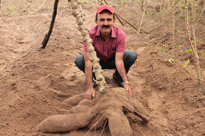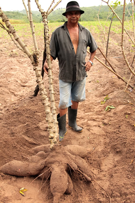 Soma de água farta para irrigação com uma adubação rica em nutrientes está fazendo com que o agricultor Adalberto dos Santos colha raízes de macaxeira que impressionam, devido ao tamanho fora padrão da espécie vegetal, em sua plantação, com túberos que podem pesar até 15 quilos e ter 60 centímetros de comprimento. Ele é um dos irrigantes do Perímetro Irrigado Jacarecica II, administrado pela Companhia de Desenvolvimento de Recursos Hídricos e Irrigação de Sergipe (Cohidro), no município de Malhador.