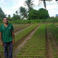 Raimundo Batista do Nascimento é outro experiente produtor orgânico do Perímetro Piauí que tem, como carro-chefe, a produção de Bata-doce, maracujá, mandioca, macaxeira e coentro. Ele também não fica para trás na inovação, com sua receita de fertilizantes. “É o ‘biogel’. Pega castanha-de-caju, pisa e bota com álcool. Em 15 dias coa e pulveriza na lavoura com água”, explicou o agricultor que também já usava a pimenta malagueta com álcool e nim, de Tal e o esterco com terra e mato, de Delfino.