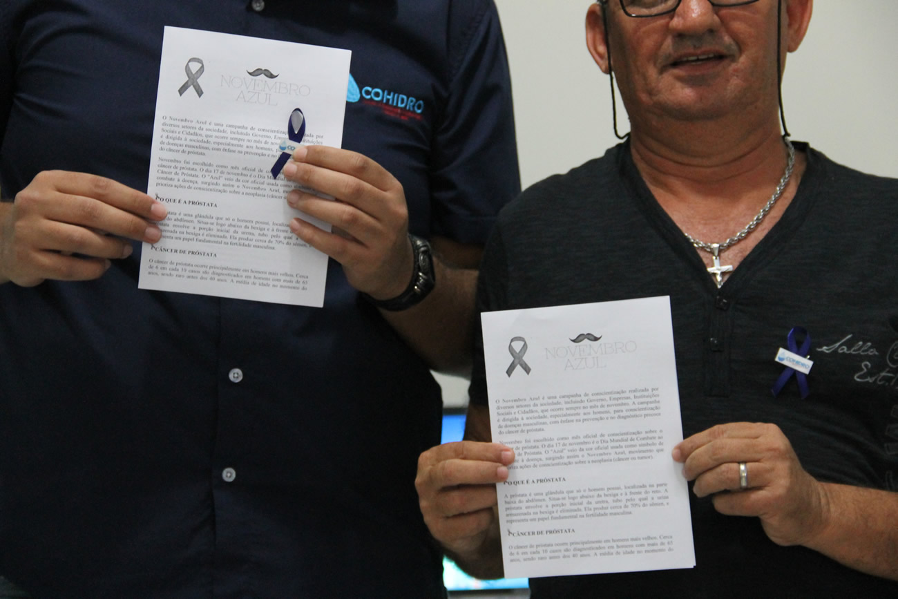 Hoje as divisões de Saúde e Segurança no Trabalho (Dissa) e Divisão de Bem-estar Social (Dibem) da Cohidro deram início ao à Campanha do Novembro Azul. Percorreram os setores da sede da empresa distribuindo panfletos educativos e as fitinhas, para uso dos simpatizantes à campanha de conscientização aos cuidados da saúde de homem, principalmente o incentivo ao diagnóstico precoce do Câncer de Próstata.