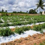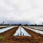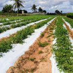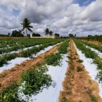 Lona branca evita crescimento de ervas daninhas, diminui temperatura para planta e melhora a fotossíntese com reflexo do sol. Fertirrigação também é utilizada