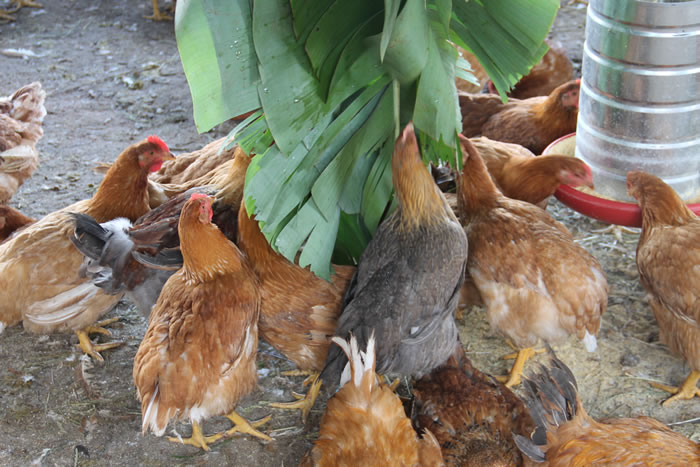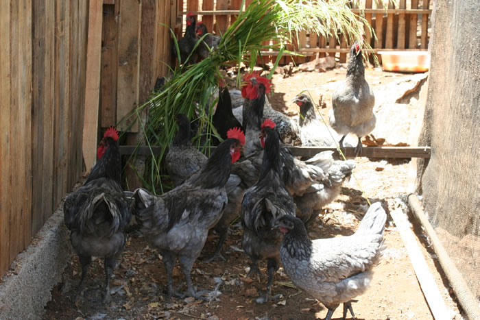 “Promovendo o acesso das aves ao pé dos pomares, cercados pelos palets, elas podem aproveitar as frutas que caem, por exemplo. Estamos ministrando aos frangos alguns tipos de capim, como o Amargoso, que na ‘cultura do campo’ é tido como erva daninha, mas as aves adoram, principalmente as sementes. O Capim alimentar e ainda traz o benefício dos frangos se esticarem ou pularem para ter acesso, assim se exercitam e tornam a carne mais rija. Outro material que temos usado com freqüência é a folha de bananeira, que além de ser bem apreciado pelos frangos, é constatado ser um vermífugo de origem natural”, listou Tito Reis.