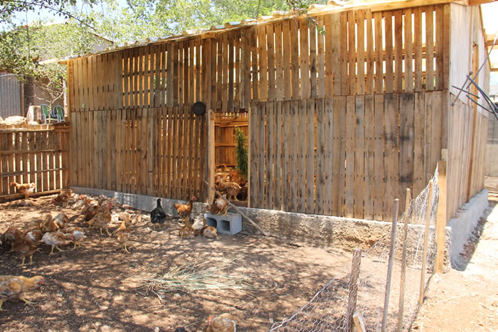 A produção de frangos do casal Quitéria e José Gonçalves de Araújo tem como particularidade o uso de palets para a construção de praticamente a totalidade da estrutura que abriga as aves, desde os abrigos fechados para a proteção ao frio e de predadores à noite, até o cercado que não deixa os animais fugirem ou terem acesso às hortas orgânicas que cultivam também. “Foram usados 300 palets, para construir o quintal e os três galpões: berçário, intermediário e para engorda”, revelou o agricultor que já tem dois anos na Bio5.