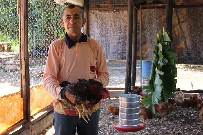 Além de Quitéria e José, serão outros quatro associados da Bio5 que terão galpões para criação de frangos para engorda e postura, baseado no mesmo sistema com o uso de palets. “Nosso projeto é um modelo, o piloto. Cada galpão comporta cerca de 100 frangos, que vamos vender vivo por R$ 30 cada, de três a quatro quilos de peso, aos 100 dias. É mais fácil vender assim vivo, só mesmo quem conhece nosso trabalho é capaz de comprar abatido, fica desconfiado”, relatou Seu José, que cria as raças “Rhode Vermelha” e “gigante negro”. Por possuir horta orgânica, tem atenção especial com a cama de frango, que serve de adubo.