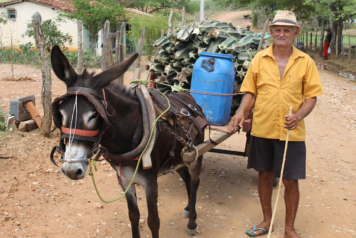 Brás Matias dos Santos cria 8 cabeças de gado e 10 ovelhas no Ouricuri. Ele conta que a barragem comunitária que foi reformada “estava seca antes dessa chuva, agora encheu duma vez. Quando falta água nos tanques, quando ela acaba, passamos a usar a da barragem”, explicou o produtor. Ele trazia o Mandacaru para alimentar suas vacas, um das alternativas com que conta no Sertão, assim como o reservatório maior, onde leva os animais para beber no momento de precisão.